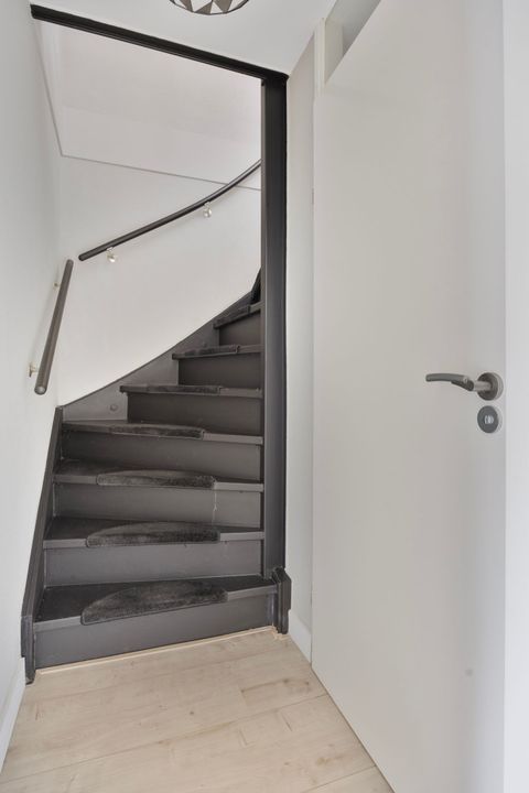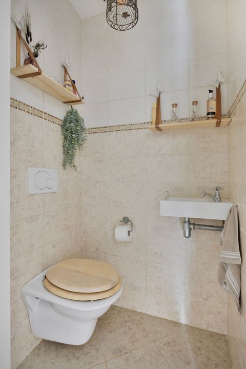 From the living room, you can also access a separate hallway leading to the first floor via a fixed staircase. This hallway also provides access to the fully tiled guest toilet, equipped with a small sink.