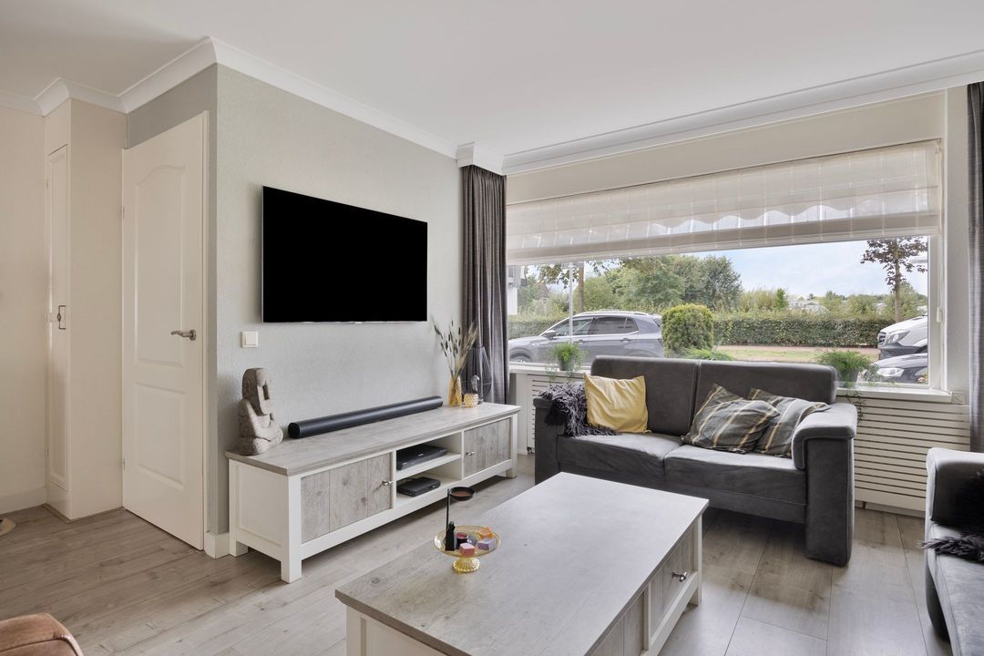 From the hallway, you access the living room, which benefits from abundant natural light thanks to large windows at both the front and rear of the property. From the sitting area, you enjoy a beautiful, unobstructed view over the lively street and the spacious green playground.