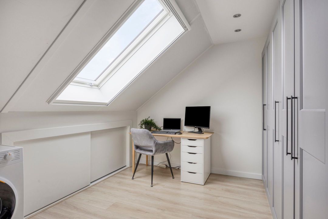 Deze kamer is momenteel ingericht als kleedruimte en kantoor en is voorzien van een dakraam, inbouwspots, bergruimte achter schuifpanelen.