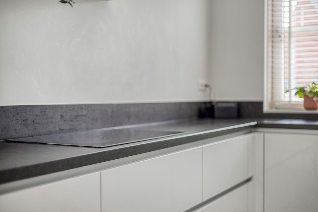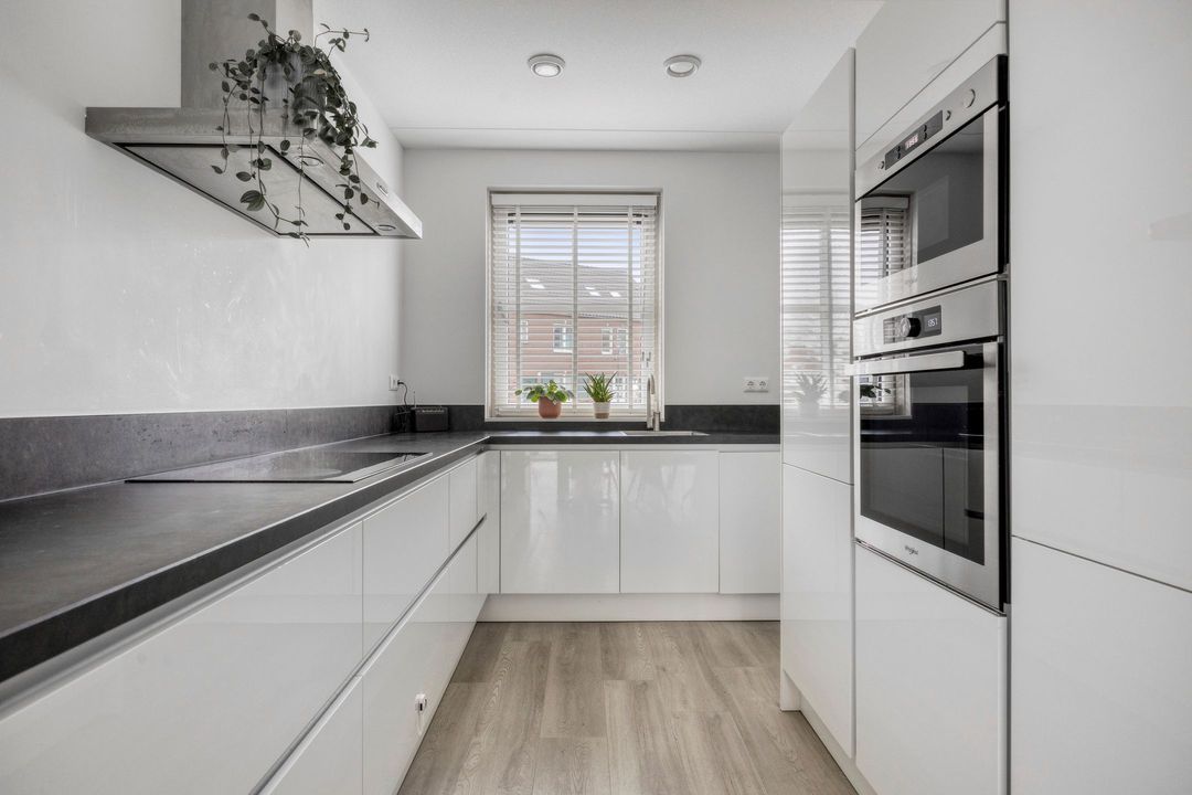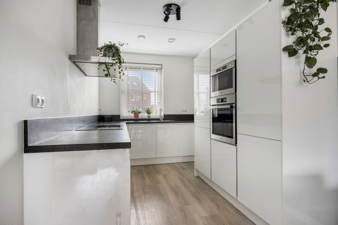De open keuken staat in directe verbinding met het eetgedeelte en is uitgevoerd in een praktische L-opstelling met veel werkruimte. Het composiet werkblad en de complete inbouwapparatuur zorgen voor een moderne uitstraling en optimaal gebruiksgemak. De keuken is uitgerust met