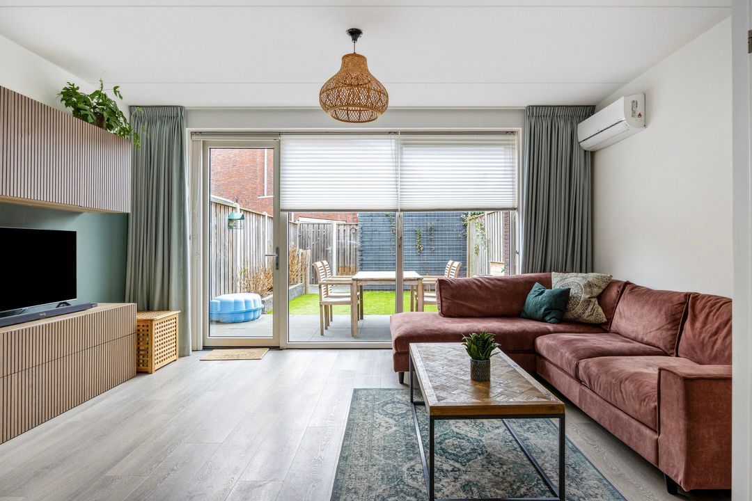 The living room is bright and comfortable, with a PVC floor with underfloor heating, light-colored walls, and a smoothly finished ceiling. The large glass rear wall with a door to the garden ensures plenty of natural light. Air conditioning further enhances comfort. A practical storage cupboard under the stairs is located in the center of the living room.