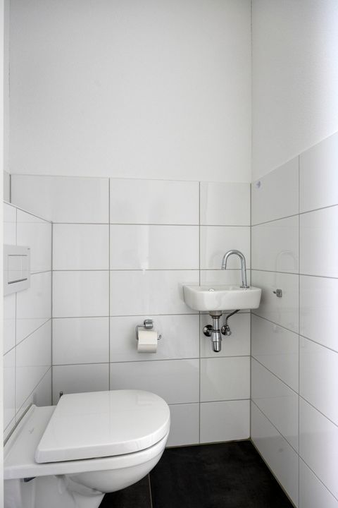 The hallway features a coat area, meter cupboard, and a modern guest toilet with a small sink. From the hall, you can access the stairs to the first floor and the living room through a door.