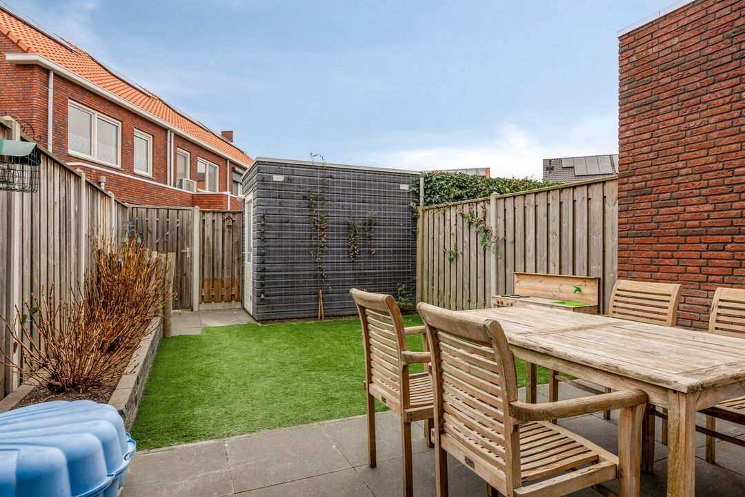 De achtertuin is verzorgd aangelegd en beschikt over een zonneterras met zonneluifel, een gazon en borders met beplanting. Via de achterpoort is de tuin bereikbaar en daarnaast is er een vrijstaande houten berging, voorzien van elektra.